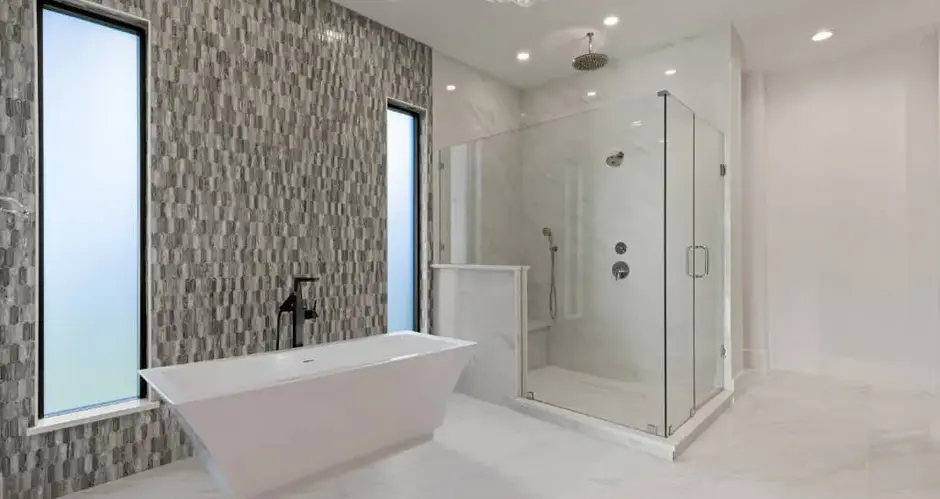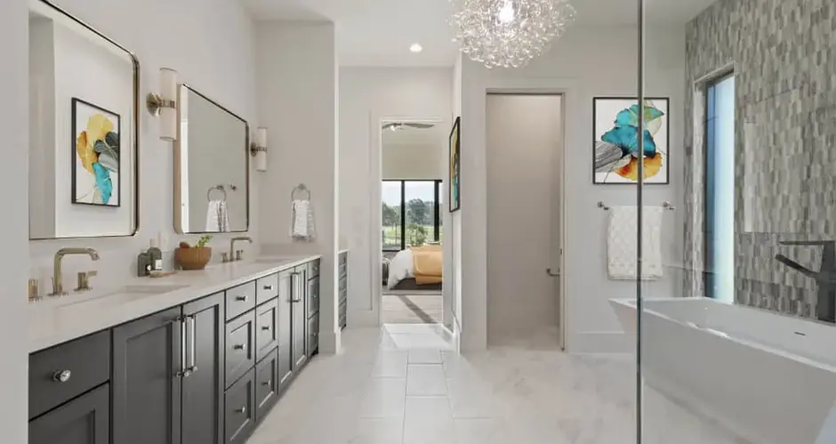 tumbled Chicago brick, custom fireplace surrounds, heated primary bath floors, large format tile on the